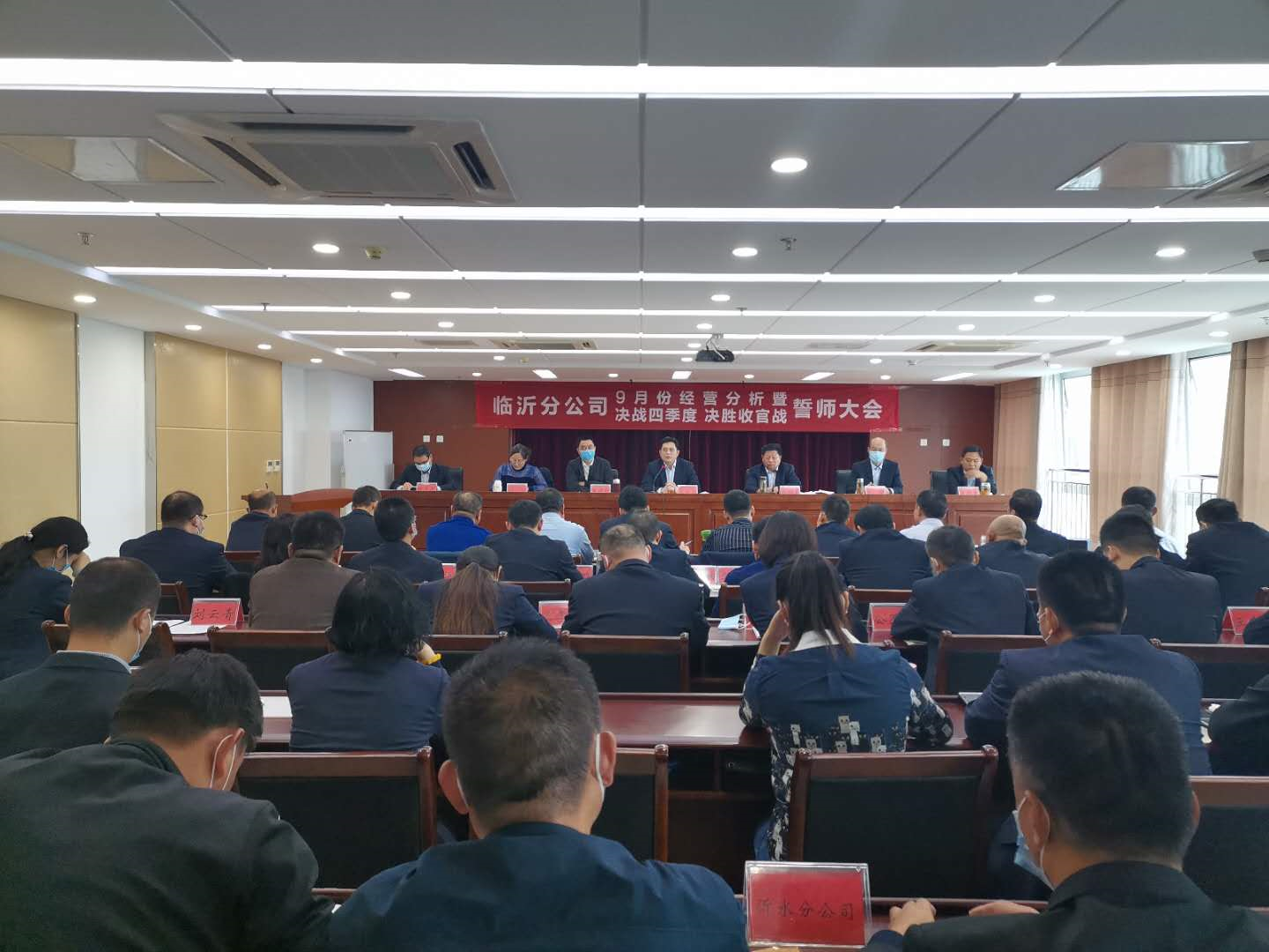 本網訊 10月13日,臨沂分公司召開9月經分會暨“決戰四季度 決勝收官戰”誓師大會,深入分析公司前三季度形勢,研究部署下一階段重點工作,進一步動員公司上下明確目標定位,堅定必勝信心,決戰四季度,決勝收官戰,確保全面完成年度任務目標。